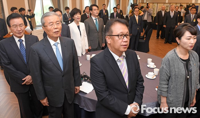 (서울=포커스뉴스) 김종인(왼쪽 두번째) 더불어민주당 비대위 대표 등 의원들이 14일 오전 서울 여의도 국회 귀빈식당에서 열린 보훈단체장과의 간담회에 참석해 애국가를 부르고 있다.