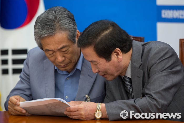 (서울=포커스뉴스) 정기섭(오른쪽) 개성공단기업협회 회장이 14일 오전 서울 여의도 국회에서 우상호 더불어민주당 원내대표와 면담에 앞서 협회 관계자와 대화를 나누고 있다.