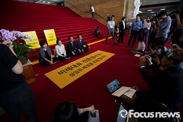 (서울=포커스뉴스) 정의당 의원들이 14일 오전 서울 여의도 국회 로텐더홀 계단 앞에서 상임위 배정 관련 기자회견을 마친 뒤 농성을 하고 있다. 왼쪽부터 이정미 원내수석부대표, 추혜선 의원, 노회찬 원내대표, 윤소하 의원.