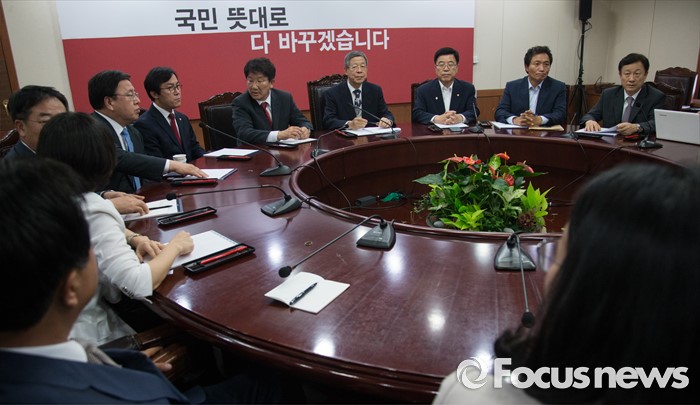 (서울=포커스뉴스) 김희옥 새누리당 혁신비상대책위원장과 김광림 정책위의장을 비롯한 혁신위원들이 14일 오후 서울 여의도 국회에서 회의를 하고 있다.