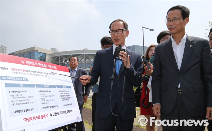 (세종=포커스뉴스) 프리미엄 고속버스 도입에 앞서 시승행사가 14일 오전 세종시 정부세종청사 제2주차장에서 열렸다. 최정호 국토교통부 2차관이 관계자로부터 기아자동차 뉴 그랜버드 프리미엄 골드 익스프레스에 대한 설명을 듣고 있다.