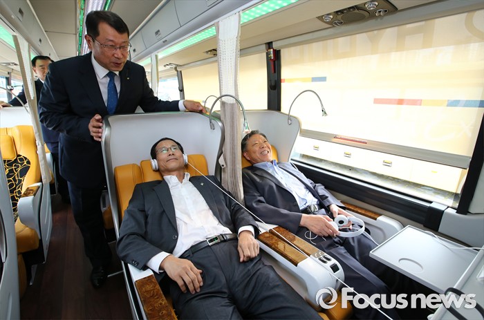 (세종=포커스뉴스) 프리미엄 고속버스 도입에 앞서 시승행사가 14일 오전 세종시 정부세종청사 제2주차장에서 열렸다. 최정호 국토교통부 2차관이 관계자로부터 현대자동차 21인승 프레스티지 유니버스에 대한 설명을 듣고 있다.