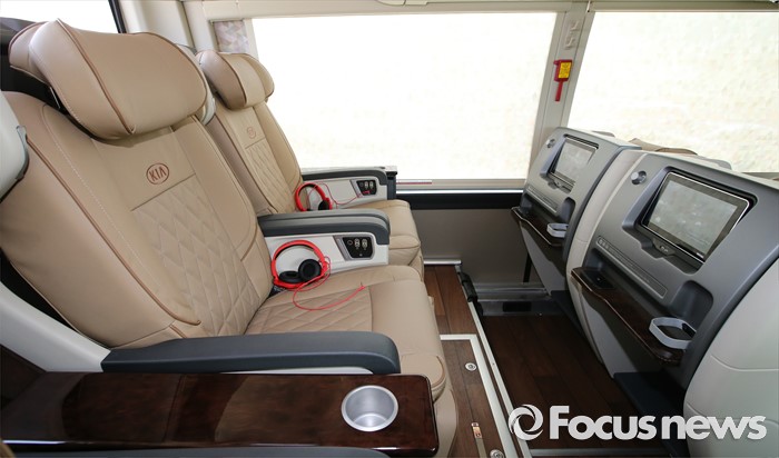 (세종=포커스뉴스) 프리미엄 고속버스 도입에 앞서 시승행사가 14일 오전 세종시 정부세종청사 제2주차장에서 열렸다. 사진은 기아자동차 뉴 그랜버드 프리미엄 골드 익스프레스 내부모습.