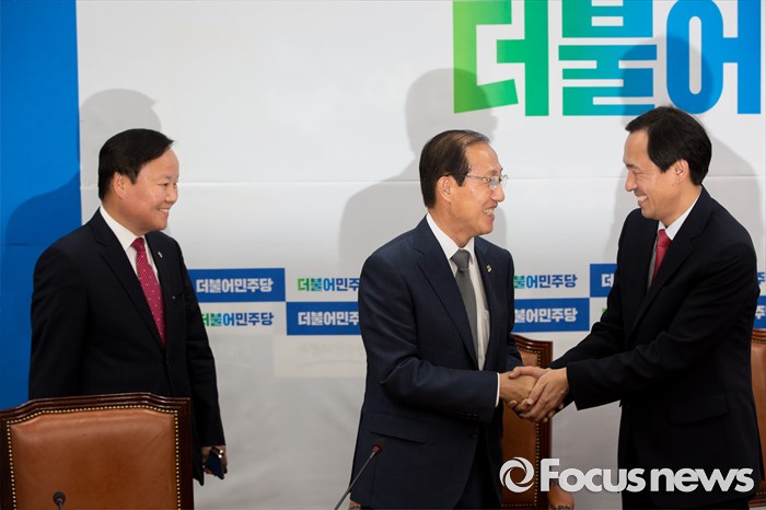 (서울=포커스뉴스) 우상호(오른쪽) 더불어민주당 원내대표가 14일 오후 서울 여의도 국회에서 이원종(가운데) 대통령비서실장과 면담에 앞서 악수 하고 있다.