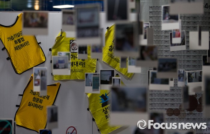 (서울=포커스뉴스)14일 오후 서울 중구 서울시민청에서 '2000일간의 기록-가습기살균제 피해 사진전'이 열리고 있다. 가습기살균제 피해자와 가족모임과 환경보건시민센터가 주관하는 이번 전시는 23일까지 열리며 가습기살균제 피해자 사진과 항의행동 기록, 희생자에 대한 추모 기록 등이 전시된다.