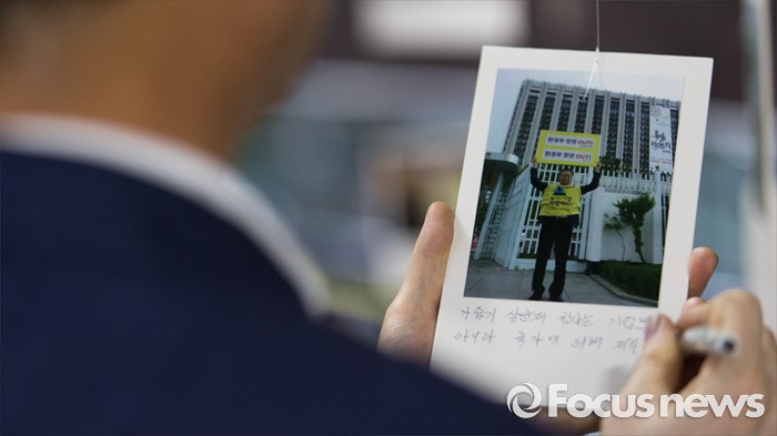 (서울=포커스뉴스)14일 오후 서울 중구 서울시민청에서 열린 '2000일간의 기록-가습기살균제 피해 사진전' 개전식에 참석한환경보건시민센터 관계자가 사진에 메모하고 있다. 이번 전시는 23일까지 열리며 가습기살균제 피해자 사진과 항의행동 기록, 희생자에 대한 추모 기록 등이 전시된다.