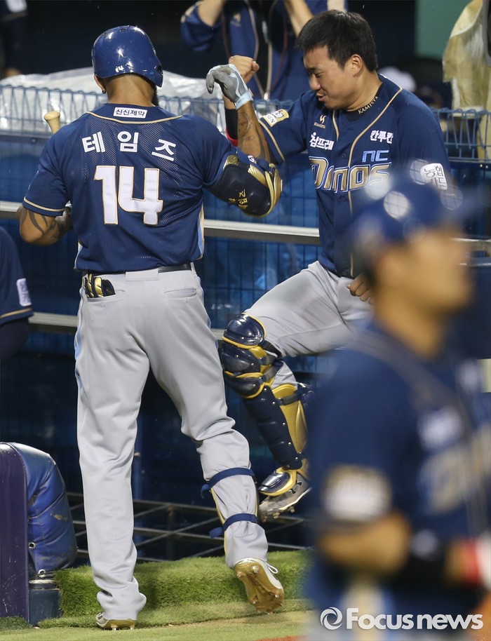 (서울=포커스뉴스) 14일 서울 잠실구장에서 열린 2016 프로야구 NC-LG 경기 6회초 1사후 NC 테임즈가 우월 솔로 홈런을 치고 덕아웃에서 김태군과 특유의 세레머니를 하고 있다.
