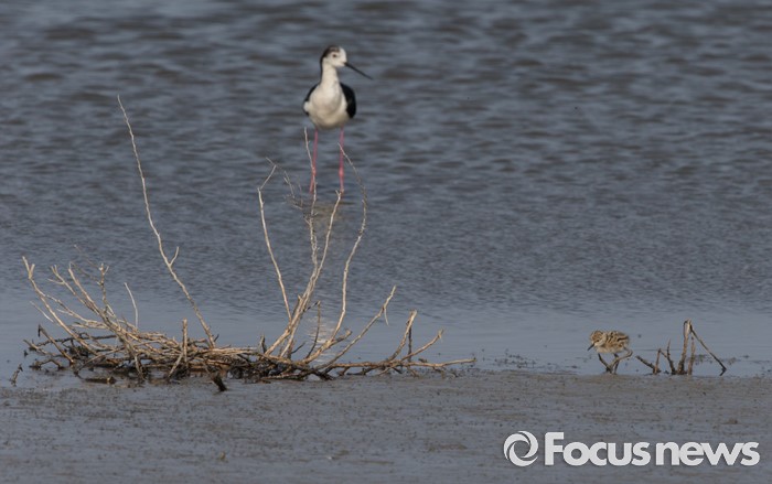 (인천=포커스뉴스) 부화한지 반나절 된 장다리물떼새 새끼가 습지가에서 먹이를 찾자, 어미가 곁에서 지켜보고 있다.