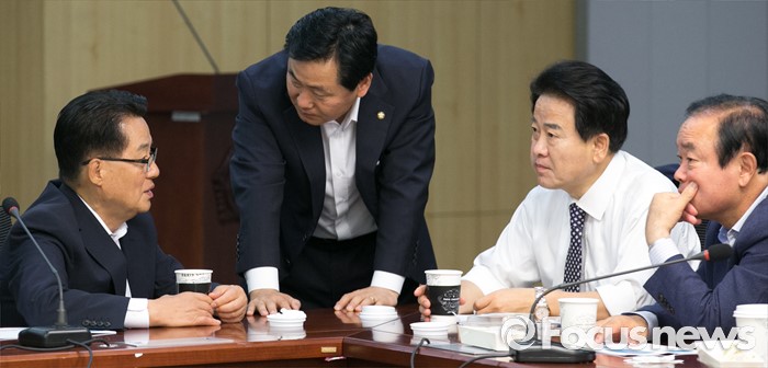 (서울=포커스뉴스) 15일 오전 서울 여의도 국회 의원회관에서 열린 15차 국민의당 정책역량강화 집중 워크숍에 참석한 박지원(왼쪽부터) 원내대표, 김관영 원내수석부대표, 정동영, 장병완 의원이 대화하고 있다.