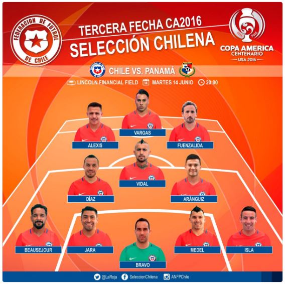 칠레는 15일 오전 9시(한국시간) 미국 필라델피아 링컨파이낸셜필드에서 파나마와의 코파 아메리카 센테나리오 2016 D조 3차전을 치른다.