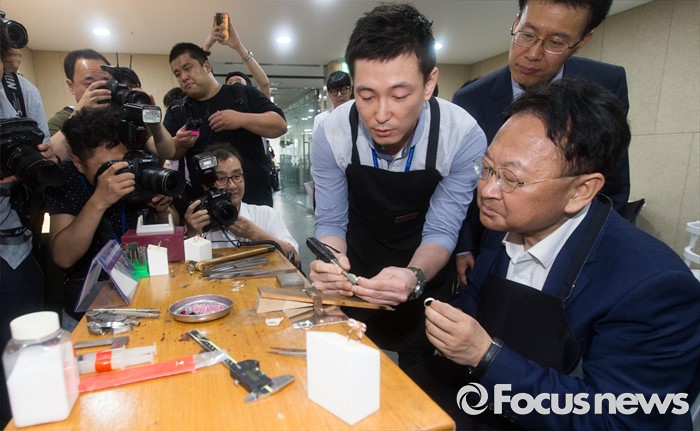 (서울=포커스뉴스) 유일호 경제부총리 겸 기획재정부 장관이 15일 오전 서울 종로구 서울창조경제혁신센터 부속 인큐베이팅 센터에서 입주기업을 둘러보던 중 보석 세공 작업을 체험하고 있다.