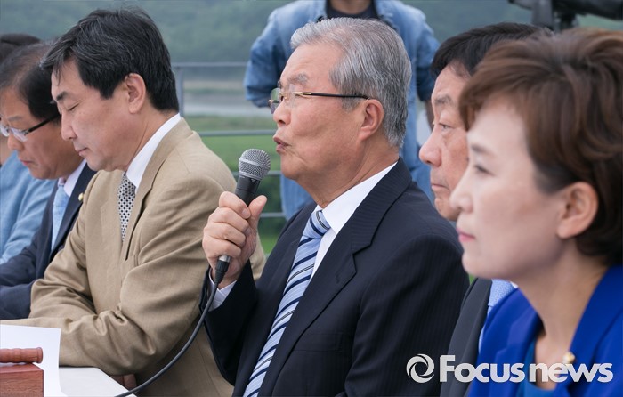 (파주=포커스뉴스) 15일 오전 경기도 파주 임진각 통일전망대에서 열린 더불어민주당 비상대책위원회의에 참석한 김종인 비대위 대표가 모두발언을 하고 있다.