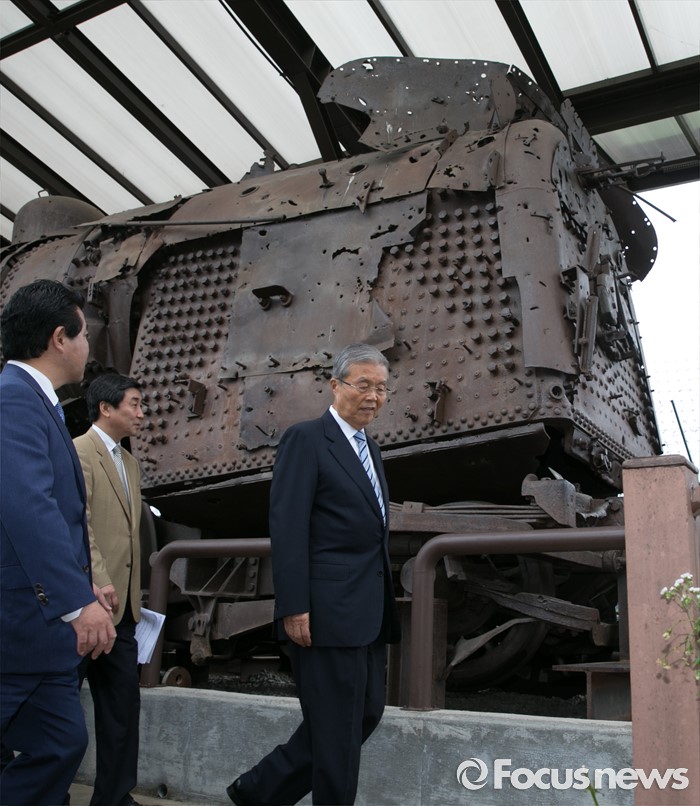 (파주=포커스뉴스) 15일 오전 경기도 파주 임진각 통일전망대에서 더불어민주당 비상대책위원회의를 마친 김종인 비대위 대표와 의원들이 전시된 경의선 장단역 증기기관차를 둘러보고 있다.