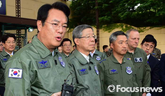 (오산=포커스뉴스) 김희옥(가운데) 새누리당 혁신비대위원장과 정진석(왼쪽) 원내대표 등 의원들이 15일 오전 경기도 오산 공군작전사령부를 방문해 방위태세 현황 등 보고를 받기에 앞서 취재진 질문에 답하고 있다. 오른쪽은 이왕근 공군 작전사령관.