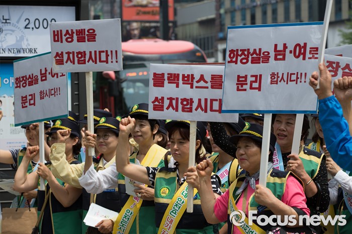 (서울=포커스뉴스) 15일 오전 서울 강남구 강남역인근에서 안전문화운동 실천협의회, 여성 민방대원들이 여성 안전 대책을 촉구하며 캠페인을 벌이고 있다.