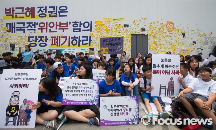 (서울=포커스뉴스) 15일 오후 서울 종로구 옛 일본대사관 앞에서 제1235차 일본군 위안부 문제해결을 위한 정기 수요집회가 열리고 있다.