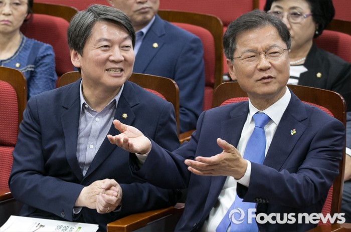 (서울=포커스뉴스) 15일 오후 서울 여의도 국회 의원회관에서 열린 '소비자 집단소송과 징벌적 손해배상제도 쟁점과 방향' 토론회에 참석한 안철수(왼쪽) 국민의당 상임공동대표, 천정배 공동대표가 서로 축사 순서를 양보하고 있다.