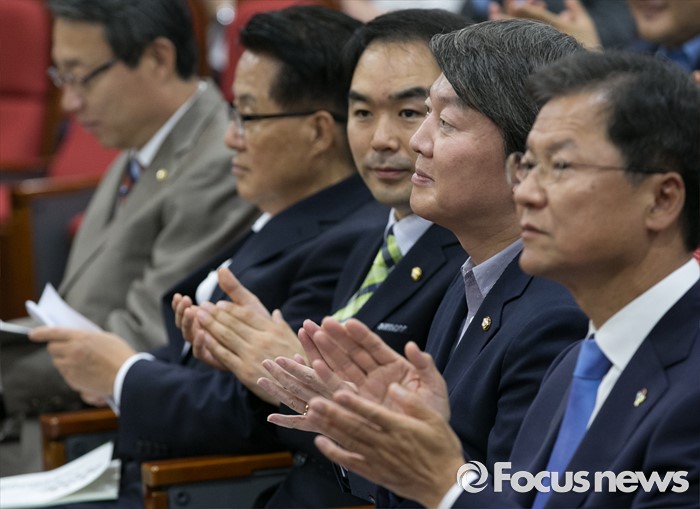 (서울=포커스뉴스) 15일 오후 서울 여의도 국회 의원회관에서 열린 '소비자 집단소송과 징벌적 손해배상제도 쟁점과 방향' 토론회에 참석한 국민의당 의원들이 박수치고 있다. 오른쪽부터 천정배 공동대표, 안철수 상임공동대표, 채이배 의원, 박지원 원내대표, 김성식 정책위의장.