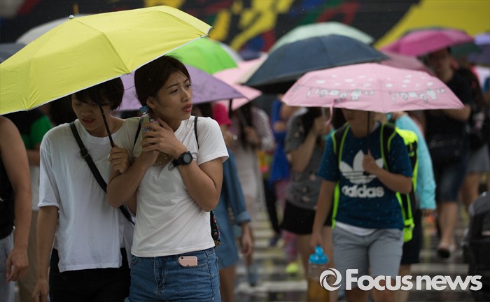 (서울=포커스뉴스) 전국적으로 비가 내리는 15일 오후 서울 종로구 광화문광장을 지나는 외국인 관광객들이 비를 피해 발걸음을 재촉하고 있다.