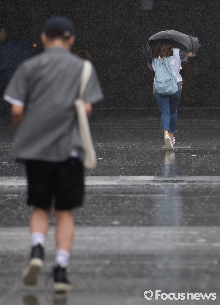 (서울=포커스뉴스) 전국적으로 비가 내리는 15일 오후 서울 종로구 광화문광장을 지나는 시민들이 비를 피해 발걸음을 재촉하고 있다.
