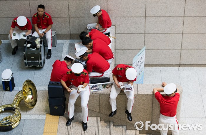 (서울=포커스뉴스) 15일 오후 서울 강남구 코엑스에서 열린 2016 서울국제도서전에서 9보병사단 군악대 장병들이 휴식시간에 독서를 하고 있다.