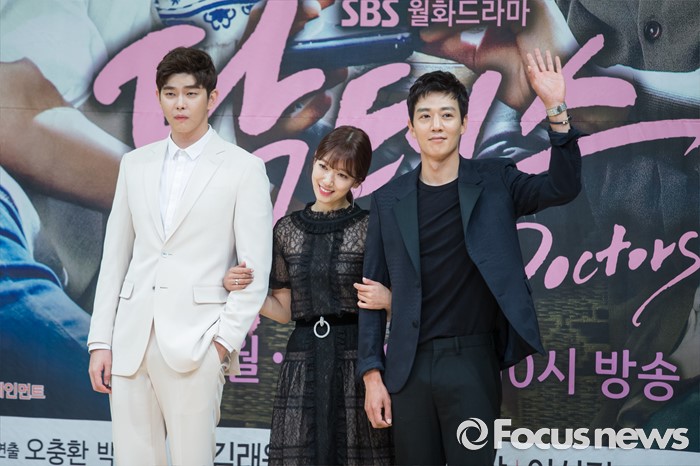 (서울=포커스뉴스) 15일 오후 서울 양천구 SBS목동사옥에서 열린 SBS 월화드라마 '닥터스' 제작발표회에 참석한 배우 윤균상(왼쪽부터), 박신혜, 김래원이 포토타임을 갖고 있다.