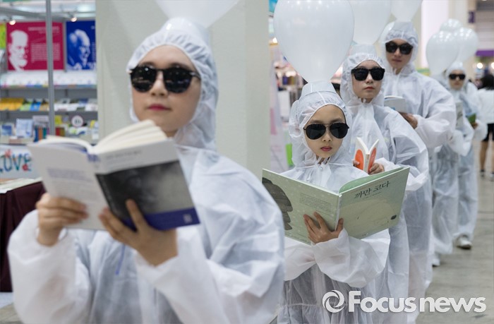 (서울=포커스뉴스) 15일 오후 서울 강남구 코엑스에서 열린 2016 서울국제도서전에서 상상발전소 관계자들이 독서를 장려하는 퍼포먼스를 하고 있다.