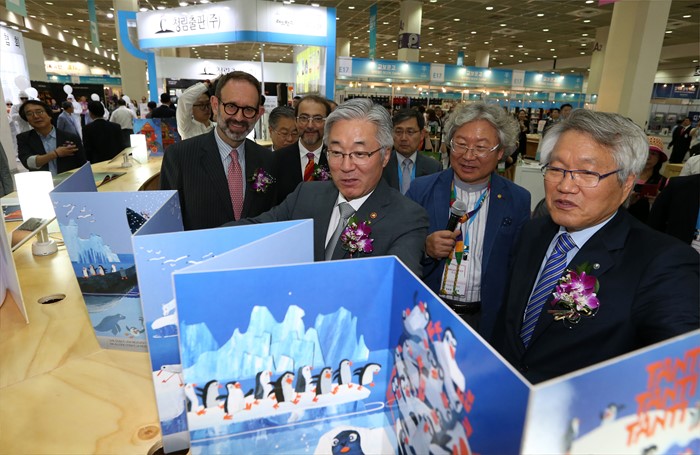 (서울=포커스뉴스) 김종덕 문화체육관광부 장관이 15일 서울 강남구 코엑스에서 열린 ‘제22회 서울국제도서전 및 제3회 디지털북페어코리아 개막식‘을 마치고 내빈들과 함께 관계자의 안내로 전시장을 둘러보고 있다. <사진제공=문화체육관광부>