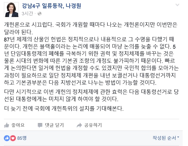 나경원 의원은 이날 오후 자신의 페이스북에 이같이 밝히며 "5년 단임대통령제의 폐해를 극복하기 위한 권력 및 정치체제를 바꾸는 것은 물론 시대의 변화에 따른 기본권 조항의 개정도 불가피하다"고 주장했다.