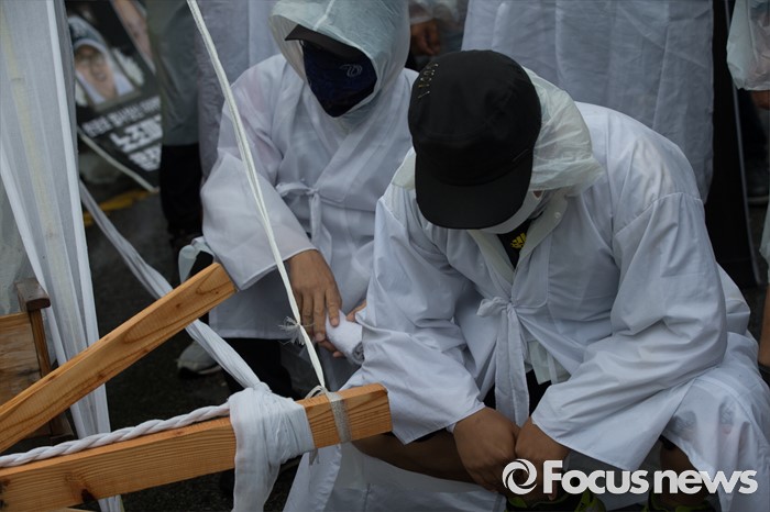(서울=포커스뉴스) 15일 오후 유성기업 노동자 故 한광호씨의 분향소를 양재동 현대차 본사 앞으로 옮기는 꽃길 100리 행진에 참여한 노동자들이 현대차 본사 앞에서 분향소 설치로 인한 문제로 실랑이를 벌이고 있다.