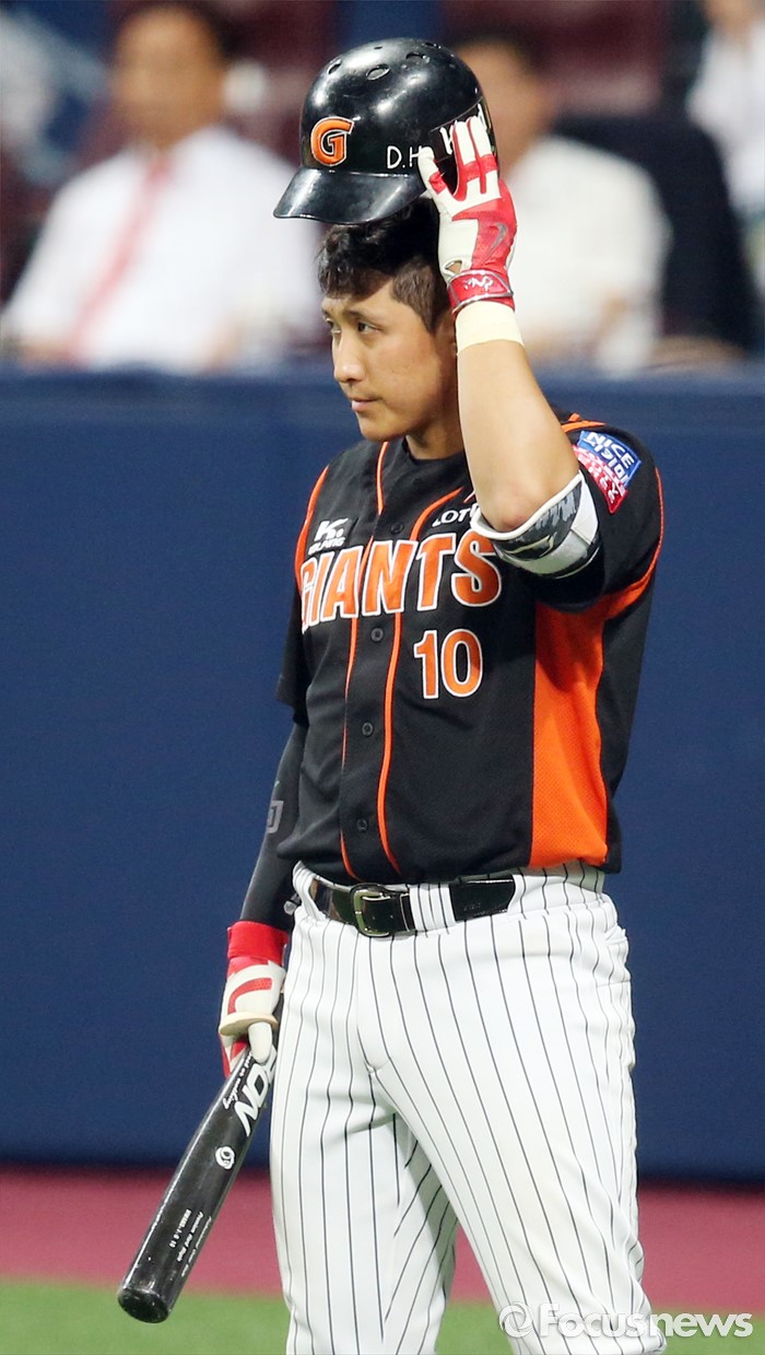 (서울=포커스뉴스) 15일 서울 고척 스카이돔에서 열린 2016 프로야구 롯데-넥센 경기 4회초 롯데 황재균이 머리쪽 위협구를 피한 다음 헬맷을 고쳐 쓰며 넥센 투수 박정준을 쏘아 보고 있다.