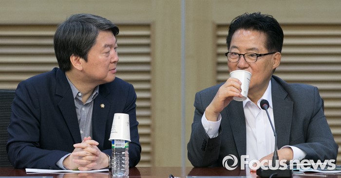 (서울=포커스뉴스) 16일 오전 서울 여의도 국회 의원회관에서 열린 국민의당 16차 정책역량강화 워크숍에 참석한 안철수(왼쪽) 상임공동대표와 박지원 원내대표가 대화하고 있다.