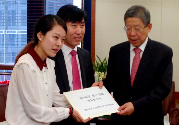 (서울=포커스뉴스) 하태경(가운데) 새누리당 부산시당 혁신위원장이 16일 오전 서울 여의도 당사를 방문해 김희옥(오른쪽) 혁신비대위원장에게 20대 총선 패배 원인 및 건의사항 등이 담긴 활동보고서를 전달하고 있다. <사진제공=하태경 의원실>