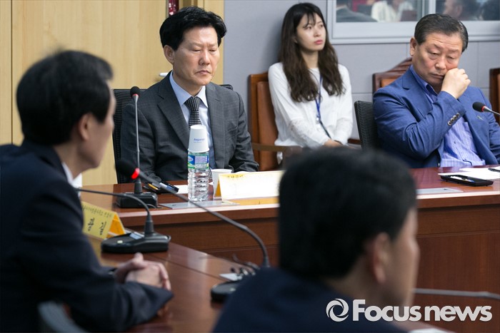 (서울=포커스뉴스) 16일 오전 서울 여의도 국회 의원회관에서 열린 남북경제협력사업 중단에 따른 손실보상에 관한 특별법안 토론회에 참석한 김서진(왼쪽 두번째) 개성공단기업협회 상무와 신양수(오른쪽 첫번째) 금강산기업인협의회장이 우상호(왼쪽 첫번째) 더불어민주당 원내대표가 축사를 듣고 있다.