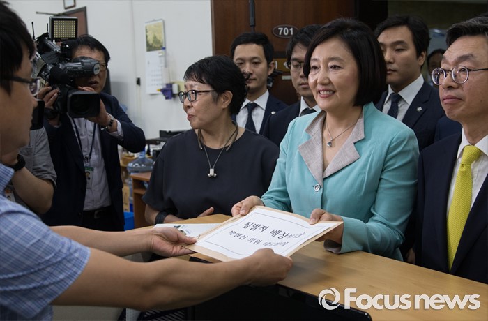 (서울=포커스뉴스) 박영선 더불어민주당 의원과 '징벌적 손해배상을 지지'하는 변호사·교수모임 대표들이 16일 오전 서울 여의도 국회 의안과에 징벌적 배상법 제정안을 접수하고 있다.
