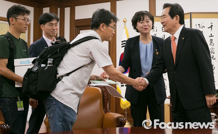 (서울=포커스뉴스) 정세균(오른쪽 첫번째) 국회의장이 16일 오전 서울 여의도 국회 의장집무실을 방문한 이정미(오른쪽 두번째) 정의당 원내수석부대표, 가습기살균제 피해자와 가족모임 등 관계자들과 면담에 앞서 인사하고 있다.