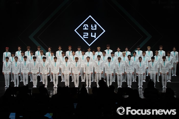 (서울=포커스뉴스) 16일 오후 서울 여의도구 63빌딩 그랜드볼룸에서 열린 보이그룹 오디션 프로그램 '소년24 프로젝트' 제작발표회에서 49명의 출연자들이 포토타임을 갖고 있다.