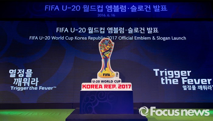 (서울=포커스뉴스) 16일 오후 서울 종로구 올레스퀘어에서 FIFA U-20 월드컵 엠블럼·슬로건이 발표되고 있다.