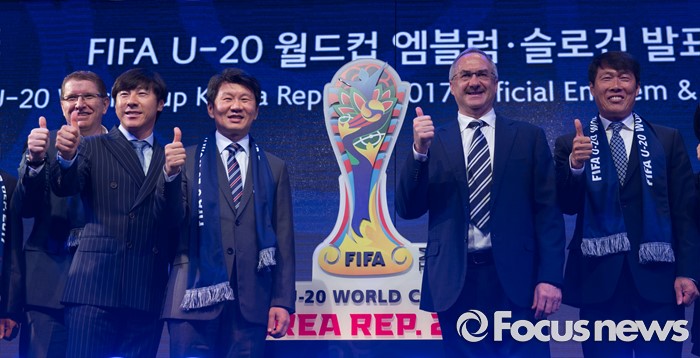 (서울=포커스뉴스) 16일 오후 서울 종로구 올레스퀘어에서 열린 FIFA U-20 월드컵 엠블럼·슬로건 발표 행사에서 티에리 바일(왼쪽) FIFA 마케팅 디렉터, 신태용 올림픽축구대표팀 감독, 정몽규 FIFA U-20 월드컵 조직위원장, 울리 슈틸리케 축구대표팀 감독, 차범근 부위원장이 기념촬영을 하고 있다.