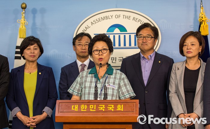 (서울=포커스뉴스) 국회 환경미화노동조합원들과 더불어민주당 을지로위원회 소속 위원들이 16일 오후 서울 여의도 국회에서 정세균 국회의장의 국회 환경미화원 직접고용 입장 발표에 환영의 뜻을 밝히는 기자회견을 하고 있다.