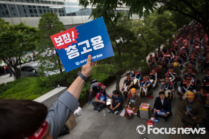 (서울=포커스뉴스) 이틀 전 총파업을 결의한 대우조선해양 노조가 16일 오후 서울 여의도 산업은행 앞에서 사측의 일방적 구조조정에 반대하며 상경투쟁을 벌이고 있다.