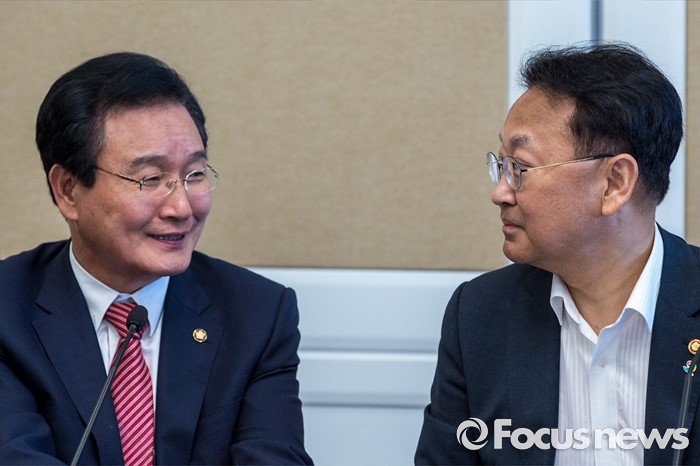 (서울=포커스뉴스) 변재일(왼쪽) 더불어민주당 정책위의장과 유일호 경제부총리 겸 기획재정부 장관이 16일 오후 서울 여의도 국회에서 열린 '3당 정책위의장 2차 민생경제 현안점검회의'에 참석해 대화를 나누고 있다.
