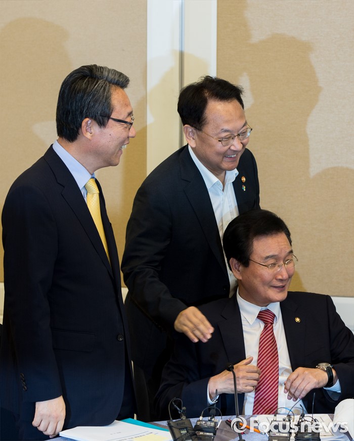 (서울=포커스뉴스) 변재일(오른쪽) 더불어민주당 정책위의장과 유일호(가운데) 경제부총리 겸 기획재정부 장관이 16일 오후 서울 여의도 국회에서 열린 '3당 정책위의장 2차 민생경제 현안점검회의'에 참석해 인사 나누고 있다.