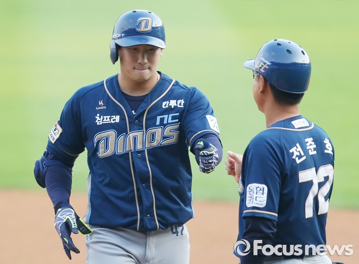 (서울=포커스뉴스) 16일 서울 잠실구장에서 열린 2016 프로야구 NC-LG 경기 1회초 1사 2루에서 좌전 적시타를 날린 NC 나성범이 전준호 코치와 주먹을 마주치고 있다.