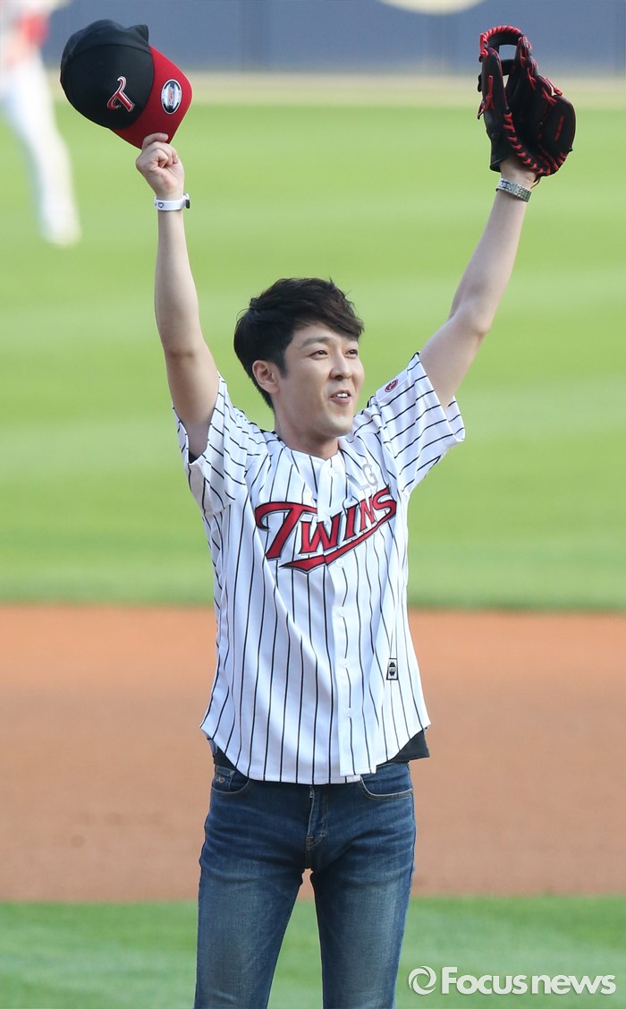 (서울=포커스뉴스) 16일 서울 잠실구장에서 열린 2016 프로야구 NC-LG 경기에서 스윗소로우의 가수 인호잔이 시구를 마치고 두 손을 들어 팬들의 환호에 답하고 있다.
