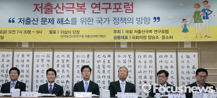 (서울=포커스뉴스) 17일 오전 서울 여의도 국회 귀빈식당에서 열린 국회 저출산극복 연구포럼 1차 회의에 참석한 김종인 더불어민주당 비대위 대표 등 내빈들이 참석해 자리하고 있다. 왼쪽부터 박병석 더불어민주당 의원, 포럼 공동대표인 윤소하 정의당 의원과 양승조 더불어민주당 의원, 김종인 비대위 대표, 정진엽 보건복지부 장관, 정우택 새누리당 의원.