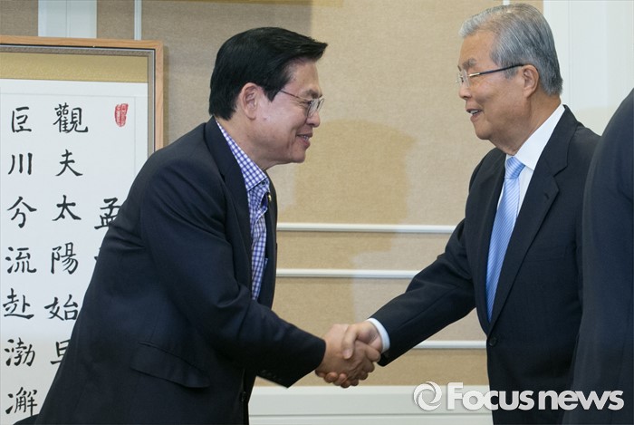 (서울=포커스뉴스) 17일 오전 서울 여의도 국회 귀빈식당에서 열린 국회 저출산극복 연구포럼 1차 회의에 참석한 김종인(오른쪽) 더불어민주당 비대위 대표와 정우택 새누리당 의원이 인사하고 있다.
