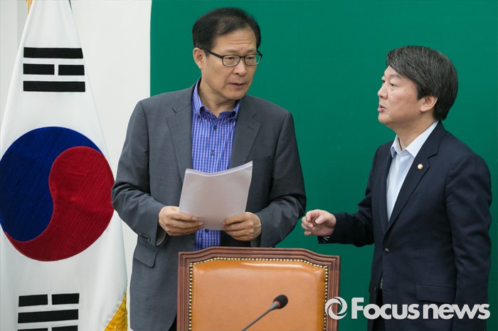 (서울=포커스뉴스) 17일 오전 서울 여의도 국회에서 열린 국민의당 최고위원회의에 참석한 안철수(오른쪽) 상임공동대표와 문병호 전략홍보본부장이 대화하고 있다.