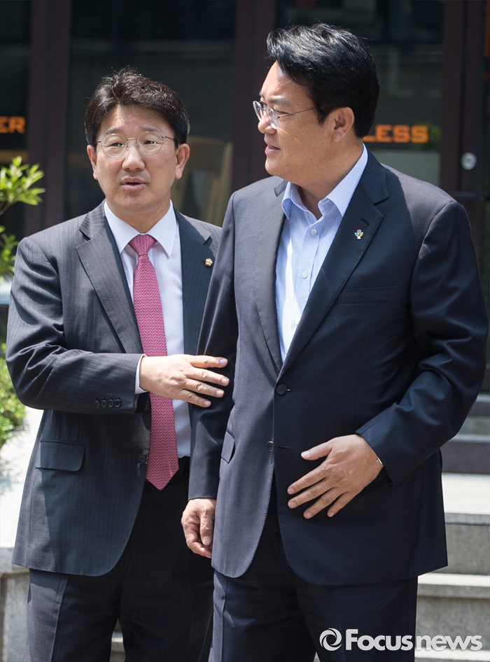(서울=포커스뉴스) 정진석(오른쪽) 새누리당 원내대표가 17일 오후 서울 여의도 한 음식점에서 비공개 오찬약속을 위해 이동하며 권성동 사무총장과 대화하고 있다.