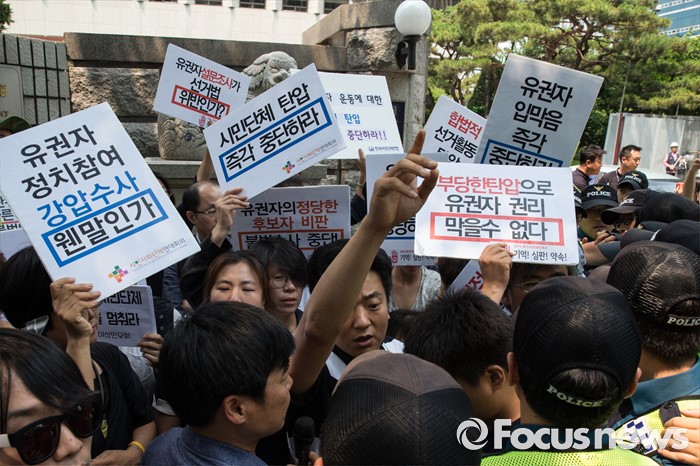 (서울=포커스뉴스) 17일 오후 서울 종로구 서울지방경찰청 앞에서 총선네트워크(총선넷) 회원들이 경찰 과잉수사 및 압수수색 규탄 기자회견에 앞서 자리문제로 경찰과 마찰을 빚고 있다.